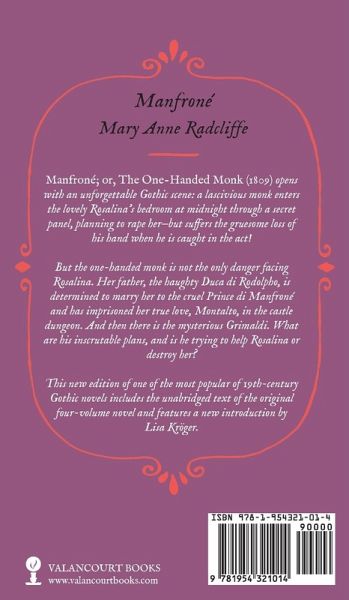 Manfroné; or, The One-Handed Monk (1809) opens with an unforgettable Gothic scene: a lascivious monk enters the lovely Rosalina's bedroom at midnight through a secret panel, planning to rape her-but suffers the gruesome loss of his hand when he is caught in the act! But the one-handed monk is not the only danger facing Rosalina. Her father, the haughty Duca di Rodolpho, is determined to marry her to the cruel Prince di Manfroné and has imprisoned her true love, Montalto, in the castle dungeon. And then there is the mysterious Grimaldi. What are his inscrutable plans, and is he trying to help Rosalina or destroy her? This new edition of one of the most popular of 19th-century Gothic novels includes the unabridged text of the original four-volume novel and features a new introduction by Lisa Kröger.