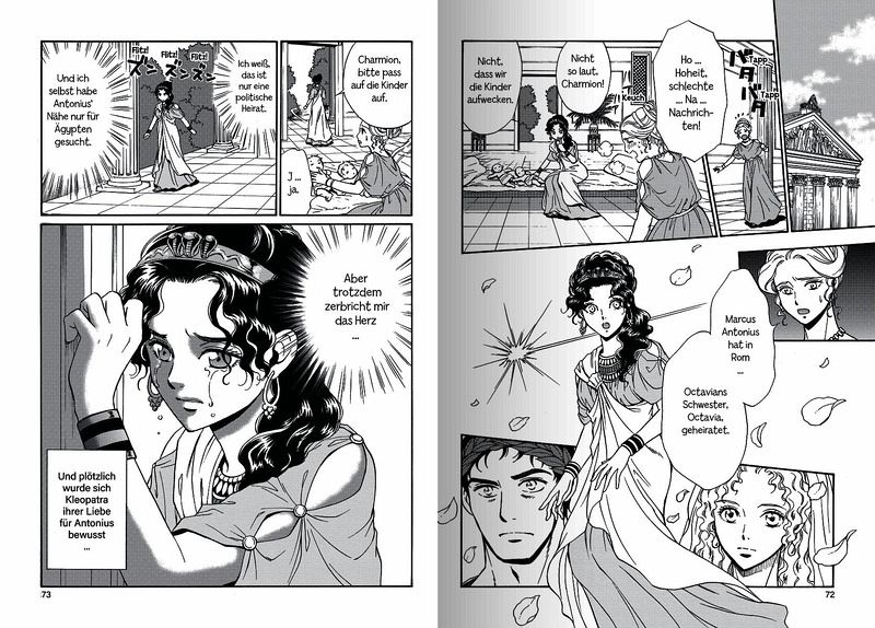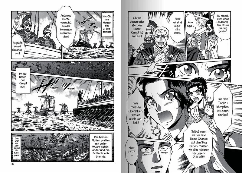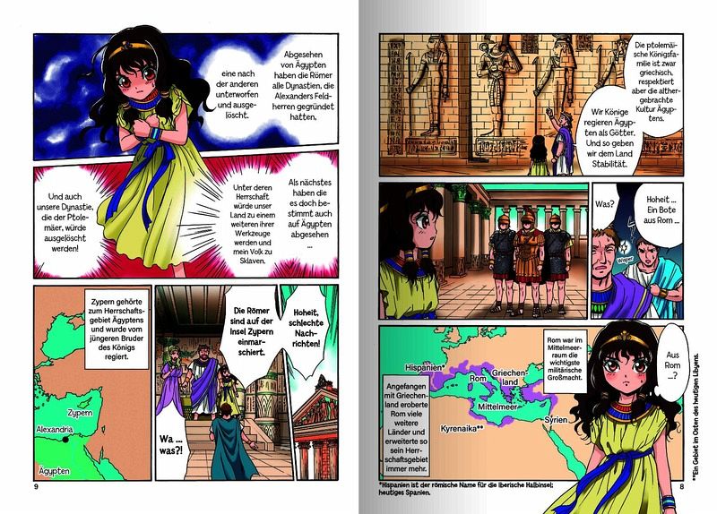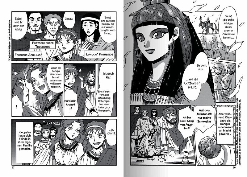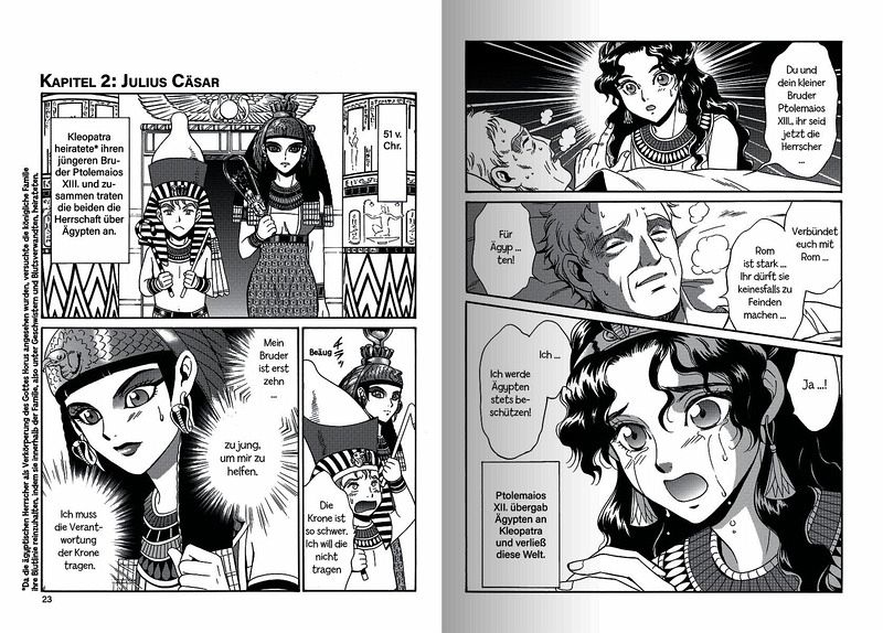 Diese Reihe präsentiert das Leben historischer Persönlichkeiten aus Politik, Kunst und Wissenschaft in einem künstlerisch ausgereiften und informationsreichen Manga-Format. Spannend und humorvoll lassen die Titel den Leser an den Höhen und Triumphen und Niederlagen teilhaben und vermitteln Einblicke in Kultur und Gesellschaft vergangener Epochen. Anhänge mit zusätzlichem Info- und Kartenmaterial runden die Titel ab.Erleben wir Aufstieg und Niedergang der letzten Königin Ägyptens, einer Herrscherin zwischen dem Erbe einer immens reichen Kultur und den Herausforderungen ihrer Gegenwart. Auf künstlerisch hohem Niveau zeigt der Manga Kleopatras Kindheit und Familie vor dem Hintergrund der kulturellen Tradition ihres Landes, ihr schwieriges Verhältnis zum römischen Reich und seinen höchsten Repräsentanten Julius Caesar und Marc Anton, denen sie stets auf Augenhöhe zu begegnen sucht.Die Reihe erscheint erstmals in deutscher Sprache und wird fortgesetzt.