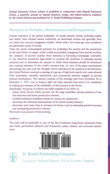 I: Introduction.- II: The Basic Data.- I Problem Addressed and a Summary of the Discussion.- II Sampling and Surveying Techniques.- III: The Reliability of Available Data on Element Concentrations in Sea-Floor Manganese Nodules.- IV: The Frequency Distribution of Nickel, Copper and Cobalt Grades in Manganese Nodule Deposits.- V: Status of the Marine Geological Activities of the Geological Survey of Japan.- III: The Mine Site.- VI: Problem Addressed and a Summary of the Discussion.- VII: Resources and Potential Reserves of Nickel and Copper in Manganese Nodule.- VIII: Determining Deep Sea-Bed Mine-Site Area Requirements - A Discussion.- IV: Commercial Considerations.- IX: Problem Addressed and a Summary of the Discussion.- X: Manganese Nodule Mining Industry: A Study of Expected Investment Requirements.- XI: The Future Outlook for the Nodule Industry.- V: The Processing Problems.- XII: Problem Addressed and a Summary of the Discussion.- XIII: Comparative Economics of Recovery of Metals from Ocean Nodules.- VI: Other Technoligical Issues.- XIV: Problem Addressed and a Summary of the Discussion.- XV: Special Aspects of Site Selection for Manganese Nodule Processing Plants.- XVI: Problems and Prospects of Technological Cooperation in Deep-Sea Mining as they Relate to Transfer of Marine Technology.- VII: Conclusions.- Conclusions.- Index of Names.- Index of Subjects.