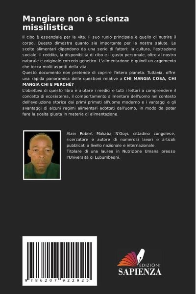 Il cibo è essenziale per la vita. Il suo ruolo principale è quello di nutrire il corpo. Questo dimostra quanto sia importante per la nostra salute. Le scelte alimentari dipendono da una serie di fattori: la cultura, l'estrazione sociale, il reddito, la disponibilità di cibo e il gusto personale, oltre al nostro naturale e originale corredo genetico. L'alimentazione è quindi un argomento che tocca molti aspetti della vita. Questo documento non pretende di coprire l'intero pianeta. Tuttavia, offre una rapida panoramica delle questioni relative a CHI MANGIA COSA, CHI MANGIA CHI E PERCHÉ?L'obiettivo di questo libro è aiutare i medici e tutti i lettori a comprendere il concetto di ecosistema, il comportamento alimentare dell'uomo nel contesto dell'evoluzione storica dai primi primati all'uomo moderno e i vantaggi e gli svantaggi di alcuni regimi alimentari adottati dall'uomo, in modo da poter fare la scelta giusta in materia di alimentazione.