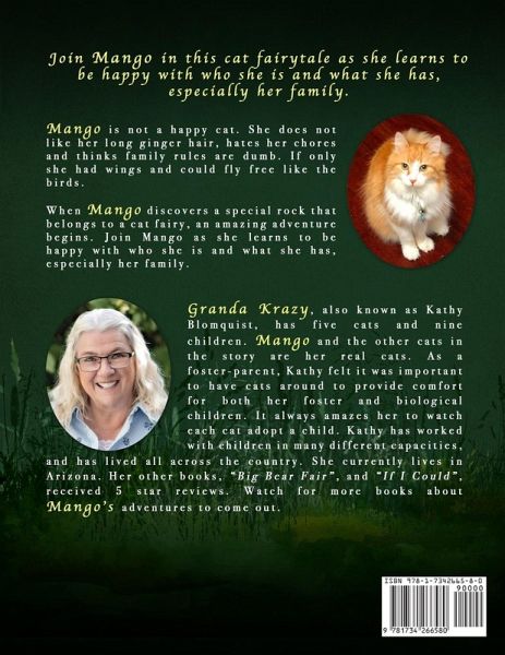 Join Mango in this cat fairy tale as she learns to be happy with who she is and what she has, especially her family. Mango is not a happy cat. She does not like her long ginger hair, hates her chores and thinks family rules are dumb. If only she had wings and could fly free like the birds. When Mango discovers a special rock that belongs to a cat fairy, an amazing adventure begins. Join Mango as she learns to be happy with who she is and what she has, especially her family.