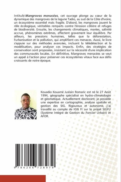 Intitulé Mangroves menacées, cet ouvrage plonge au coeur de la dynamique des mangroves de la lagune Tadio, au sud de la Côte d'Ivoire, un écosystème essentiel mais fragile. D'abord, les mangroves jouent le rôle écologique, véritables remparts contre l'érosion côtière et refuges de biodiversité. Ensuite, les changements climatiques, marées, salinité accrue, phénomènes extrêmes, affectent gravement leur équilibre. Par ailleurs, les pressions humaines, telles que la déforestation, l'urbanisation et la pollution, qui amplifient ces menaces. Aussi, le livre s'appuie sur des méthodes avancées, incluant la télédétection et la modélisation, pour analyser ces impacts. Enfin, des stratégies de conservation sont proposées, insistant sur la nécessité d'une implication des communautés locales. En définitive, Mangroves menacées se veut un appel à l'action pour préserver ces écosystèmes vitaux face aux défis croissants de notre époque.