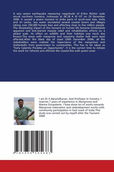 A very severe earthquake measuring magnitude of 8.9on Richter scale struck northern Sumatra, Indonesia at 06.28 A M IST on 26 December 2004. It caused a severe tsunami to strike parts of south-east Asia, India and Sri Lanka. Sea water inundated several coastal towns and villages taking over 250,000 human lives and affecting close to five million people. The devastating impact of this tsunami on human life became immediately apparent and kick-started massive relief and rehabilitation efforts on a global scale. Its effect on wildlife and their habitats was much less known.The areas with mangrove and casuarina shelter belt were least affected.After the black day of coast (26th December 2004), all the stakeholders were realized the importance of the mangroves and shelterbelts from government to communities. This has to be taken as "Early Calamity Provides an Opportunity". It is the correct time to initiate the work for reforest and afforest the coastal line with green cover.
