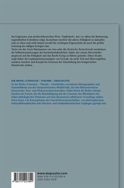 Hochmittelalterliche Adlige gründeten ihren Herrschaftsanspruch auf das Recht und die Fähigkeit zu kämpfen und Krieg zu führen und brachten dies auch in den von ihnen beauftragten und materiell geförderten Texten zum Ausdruck: Die These der Studie lautet daher, dass Texte wie Hartmanns Iwein oder die Steirische Reimchronik bestrebt sind, kriegerisches Handwerk zu inszenieren, indem nicht Gewalt und Blutvergießen, sondern manheit und Kampf ins Zentrum der Darstellung gerückt werden.