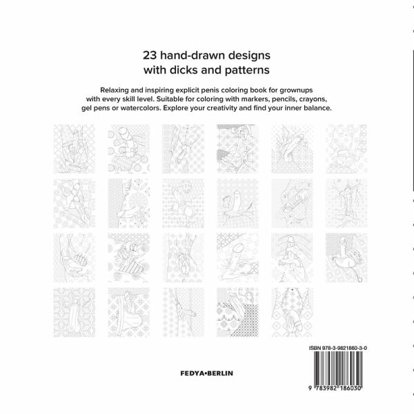 23 original illustrations for adults. Relaxing and inspiring explicit penis coloring book for grownups with every skill level. Hand-drawn designs with dicks, ornaments and patterns. Suitable for coloring with markers, pencils, crayons, gel pens or watercolors. Explore your creativity and find your inner balance.