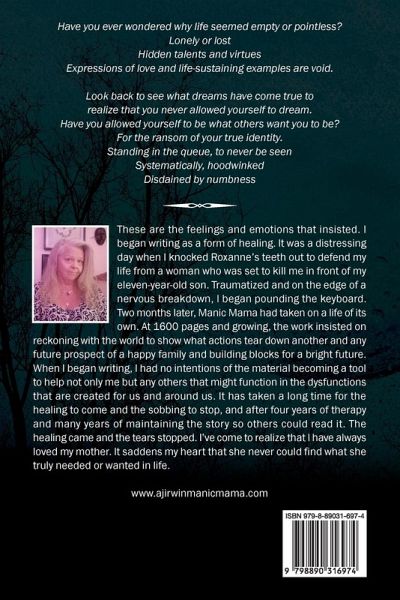 Have you ever wondered why life seemed empty or pointless? Lonely or lost Hidden talents and virtues Expressions of love and life-sustaining examples are void. Look back to see what dreams have come true to realize that you never allowed yourself to dream. Have you allowed yourself to be what others want you to be? For the ransom of your true identity. Standing in the queue, to never be seen Systematically, hoodwinked Disdained by numbness These are the feelings and emotions that insisted. I began writing as a form of healing. It was a distressing day when I knocked Roxanne's teeth out to defend my life from a woman who was set to kill me in front of my eleven-year-old son. Traumatized and on the edge of a nervous breakdown, I began pounding the keyboard. Two months later, Manic Mama had taken on a life of its own. At 1600 pages and growing, the work insisted on reckoning with the world to show what actions tear down another and any future prospect of a happy family and building blocks for a bright future. When I began writing, I had no intentions of the material becoming a tool to help not only me but any others that might function in the dysfunctions that are created for us and around us. It has taken a long time for the healing to come and the sobbing to stop, and after four years of therapy and many years of maintaining the story so others could read it. The healing came and the tears stopped. I've come to realize that I have always loved my mother. It saddens my heart that she never could find what she truly needed or wanted in life.