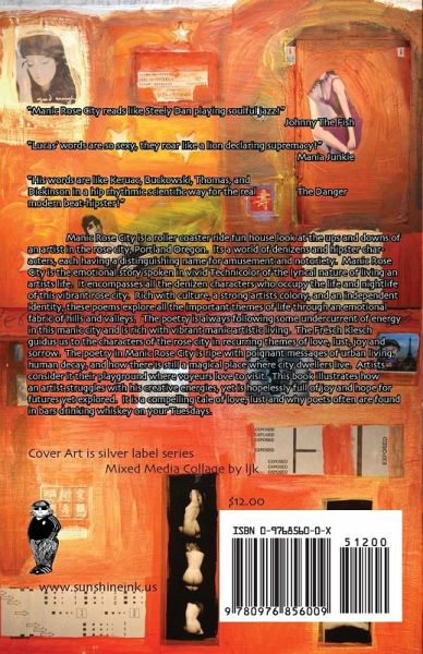 Manic Rose City is a roller coaster ride fun house look at the ups and downs of an artist in the rose city, Portland Oregon. It's a world of denizens and hipster characters, each having a distinguishing name for amusement and notoriety. Manic Rose City is the emotional story spoken in vivid Technicolor of the lyrical nature of living an artist's life. It encompasses all the denizen characters that occupy the life and nightlife of this vibrant rose city. Rich with culture, a strong artists colony, and an independent identity, these poems explore all the important themes of life through an emotional fabric of hills and valleys. The poetry is always following some undercurrent of energy in this manic city and is rich with vibrant manic artistic living. The Frësch Klesch guides us to the characters of the rose city in recurring themes of love, lust, joy and sorrow. The poetry in Manic Rose City is ripe with poignant messages of urban living, human decay, and how there is still a magical place where city dwellers live. Artists consider it their playground where voyeurs love to visit. This book illustrates how an artist struggles with his creative energies, yet is hopelessly full of joy and hope for futures yet explored. It is a compelling tale of love, lust and why poets often are found in bars drinking whiskey on your Tuesdays.
