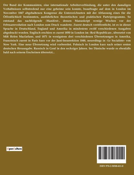 Der Bund der Kommunisten, eine internationale Arbeiterverbindung, die unter den damaligen Verhältnissen selbstredend nur eine geheime sein konnte, beauftragte auf dem in London im November 1847 abgehaltenen Kongresse die Unterzeichneten mit der Abfassung eines für die Öffentlichkeit bestimmten, ausführlichen theoretischen und praktischen Parteiprogramms. So entstand das nachfolgende ¿Manifest¿, dessen Manuskript wenige Wochen vor der Februarrevolution nach London zum Druck wanderte. Zuerst deutsch veröffentlicht, ist es in dieser Sprache in Deutschland, England und Amerika in mindestens zwölf verschiedenen Ausgaben abgedruckt worden. Englisch erschien es zuerst 1850 in London im ¿Red Republican¿, übersetzt von Miß Helen Macfarlane, und 1871 in wenigstens drei verschiedenen Übersetzungen in Amerika, Französisch zuerst in Paris kurz vor der Juni-Insurrektion 1848, neuerdings in ¿Le Socialiste¿ von New York. Eine neue Übersetzung wird vorbereitet. Polnisch in London kurz nach seiner ersten deutschen Herausgabe. Russisch in Genf in den sechziger Jahren. Ins Dänische wurde es ebenfalls bald nach seinem Erscheinen übersetzt...