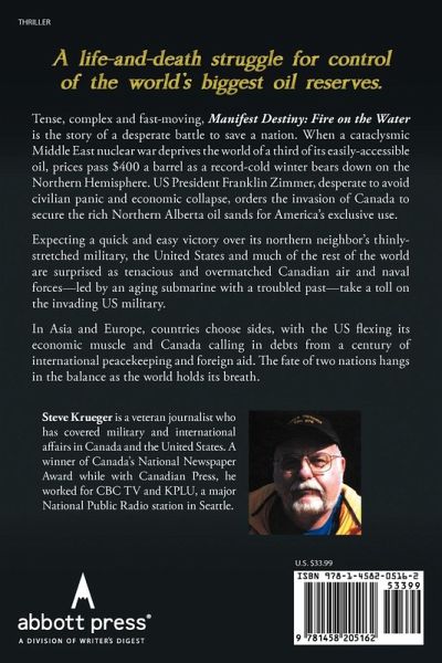 Tense, complex and fast-moving, Manifest Destiny: Fire on the Water is the story of a desperate battle to save a nation. When a cataclysmic Middle East nuclear war deprives the world of a third of its easily-accessible oil, prices pass $400 a barrel as a record-cold winter bears down on the Northern Hemisphere. US President Franklin Zimmer, desperate to avoid civilian panic and economic collapse, orders the invasion of Canada to secure the rich Northern Alberta oil sands for America's exclusive use. Expecting a quick and easy victory over its northern neighbor's thinly-stretched military, the United States and much of the rest of the world are surprised as tenacious and overmatched Canadian air and naval forces-led by an aging submarine with a troubled past-take a toll on the invading US military. In Asia and Europe, countries choose sides, with the US flexing its economic muscle and Canada calling in debts from a century of international peacekeeping and foreign aid. The fate of two nations hangs in the balance as the world holds its breath.