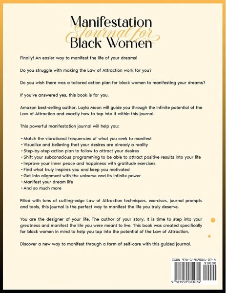 Finally! An easier way to manifest the life of your dreams! Do you struggle with making the Law of Attraction work for you? Do you wish there was a tailored action plan for black women to manifesting your dreams? If you've answered yes, this book is for you. Amazon best-selling author, Layla Moon will guide you through the infinite potential of the Law of Attraction and exactly how to tap into it within this journal. This powerful manifestation journal will help you: Match the vibrational frequencies of what you seek to manifest Visualize and believing that your desires are already a reality Step-by-step action plan to follow to attract your desires Shift your subconscious programming to be able to attract positive results into your life Improve your inner peace and happiness with gratitude exercises Find what truly inspires you and keep you motivated Get into alignment with the universe and its infinite power Manifest your dream life And so much more Filled with tons of cutting-edge Law of Attraction techniques, exercises, journal prompts, and tools, this journal is the perfect way to manifest the life you truly deserve. You are the designer of your life. The author of your story. It is time to step into your greatness and manifest the life you were meant to live. This book was created specifically for black women in mind to help you tap into the potential of the Law of Attraction. Discover a new way to manifest through a form of self-care with this guided journal. Scroll up, click "Buy Now" and get started today!