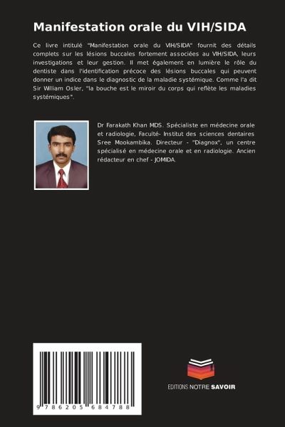 Ce livre intitulé "Manifestation orale du VIH/SIDA" fournit des détails complets sur les lésions buccales fortement associées au VIH/SIDA, leurs investigations et leur gestion. Il met également en lumière le rôle du dentiste dans l'identification précoce des lésions buccales qui peuvent donner un indice dans le diagnostic de la maladie systémique. Comme l'a dit Sir William Osler, "la bouche est le miroir du corps qui reflète les maladies systémiques".