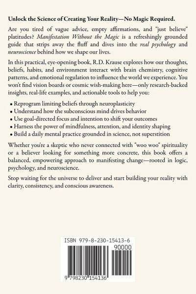 Unlock the Science of Creating Your Reality-No Magic Required. Are you tired of vague advice, empty affirmations, and "just believe" platitudes? Manifestation Without the Magic is a refreshingly grounded guide that strips away the fluff and dives into the real psychology and neuroscience behind how we shape our lives. In this practical, eye-opening book, R.D. Krause explores how our thoughts, beliefs, habits, and environment interact with brain chemistry, cognitive patterns, and emotional regulation to influence the world we experience. You won't find vision boards or cosmic wish-making here-only research-backed insights, real-life examples, and actionable tools to help you:Reprogram limiting beliefs through neuroplasticity Understand how the subconscious mind drives behavior Use goal-directed focus and intention to shift your outcomes Harness the power of mindfulness, attention, and identity shaping Build a daily mental practice grounded in science, not superstition Whether you're a skeptic who never connected with "woo woo" spirituality or a believer looking for something more concrete, this book offers a balanced, empowering approach to manifesting change-rooted in logic, psychology, and neuroscience. Stop waiting for the universe to deliver and start building your reality with clarity, consistency, and conscious awareness.