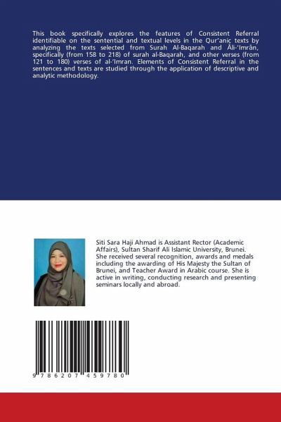This book specifically explores the features of Consistent Referral identifiable on the sentential and textual levels in the Qur'anic texts by analyzing the texts selected from Surah Al-Baqarah and Ali-'Imran, specifically (from 158 to 218) of surah al-Baqarah, and other verses (from 121 to 180) verses of al-'Imran. Elements of Consistent Referral in the sentences and texts are studied through the application of descriptive and analytic methodology.