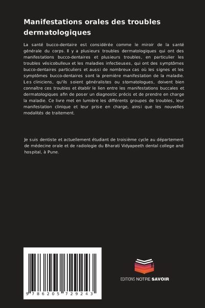 La santé bucco-dentaire est considérée comme le miroir de la santé générale du corps. Il y a plusieurs troubles dermatologiques qui ont des manifestations bucco-dentaires et plusieurs troubles, en particulier les troubles vésicobulleux et les maladies infectieuses, qui ont des symptômes bucco-dentaires particuliers et aussi de nombreux cas où les signes et les symptômes bucco-dentaires sont la première manifestation de la maladie. Les cliniciens, qu'ils soient généralistes ou stomatologues, doivent bien connaître ces troubles et établir le lien entre les manifestations buccales et dermatologiques afin de poser un diagnostic précis et de prendre en charge la maladie. Ce livre met en lumière les différents groupes de troubles, leur manifestation clinique et leur prise en charge, ainsi que les nouvelles modalités de traitement.