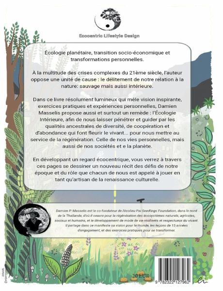 Écologie planétaire, transition socio-économique et transformations personnelles. Qu'ont en commun ces trois thèmes, et pourquoi les aborder ensemble?À la multitude des crises complexes qui secouent le 21ème siècle, l'auteur oppose une unité de cause: le délitement de notre relation à la nature: sauvage mais aussi intérieure.Dans ce livre résolument lumineux qui mèle vision inspirante, expériences personnelles et exercices pratiques, Damien Masselis propose aussi et surtout un remède: l'Écologie Intérieure, afin de nous laisser pénétrer et guider par les qualités ancestrales de diversité, de coopération et d'abondance qui font fleurir le vivant... pour nous mettre au service de la régénération. Celle de nos vies personnelles, mais aussi de nos sociétés et de la planète.En adoptant un regard écocentrique, vous développerez dans ces pages un rapport différent à vous même et au monde, et verrez se dessiner un nouveau récit des défis de notre époque et du rôle que chacun de nous est appelé à jouer en tant qu'artisan de la renaissance culturelle.