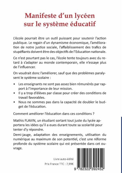 L'école pourrait être un outil puissant pour soutenir l'action publique. Le regain d'un dynamisme économique, l'amélioration de notre justice sociale, l'affaiblissement des trafics de stupéfiants doivent être des objectifs de l'Education nationale. Ce n'est pourtant pas le cas, l'école tente toujours avec du retard à s'adapter au monde contemporain, elle n'essaye plus de l'influencer. On voudrait donc l'améliorer, sauf que des problèmes paralysent le système scolaire : - Les enseignants ne sont pas assez bien rémunérés par rapport à l'importance de leur mission. - Il y a trop d'élèves par classe pour créer des conditions de travail favorables. - Nous ne sommes pas dans la capacité de doubler le budget de l'éducation. Comment améliorer l'éducation dans ces conditions ? Mathis FLAVIN, un étudiant sortant tout juste du lycée apportera les idées qu'il a eues durant toute sa scolarité pour tenter d'y répondre. Demi-jauge, adaptation des enseignements, utilisation du numérique au maximum de son potentiel, c'est une réforme profonde du système scolaire qui est présentée dans cet ouvrage.