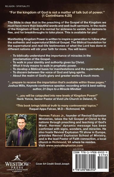 "For the kingdom of God is not a matter of talk but of power." (1 Corinthians 4:20) The Bible is clear that in the preaching of the Gospel of the Kingdom we must have more than beautiful words and well-built sermons. In the realm of the Kingdom of God, it is normal for sickness to vanish, for demons to flee, and for breakthroughs to take place. This is available for you! Manifesting Kingdom Power is written to inspire a generation to follow after the authentic and supernatural Biblical Gospel. The Biblical foundation for the supernatural and real-life testimonies of what the Lord has done in different nations will stir your faith for more. You will learn: - To biblically understand the importance of miracles in the proclamation of the Gospel. - To walk in your identity and authority given by Christ. - What it truly means to walk in prophetic power. - To develop a Biblical basis for manifestations and the supernatural. - To discern between the voice of God and lying spirits. - About the realm of God's glory and greater works & much more. "...prepare to receive the impartation that's available within these pages." Joshua Mills, Keynote conference speaker, recording artist & best-selling author, 31 Days to a Miracle Mindset "...you will be catapulted into new levels of Kingdom Power!" Hank Yonce, Senior Pastor at Vivid Life Church in Deland, FL "This book brings biblical truth to many controversial topics." Raquel Appa Falcao, M.D - Richmond, VA
