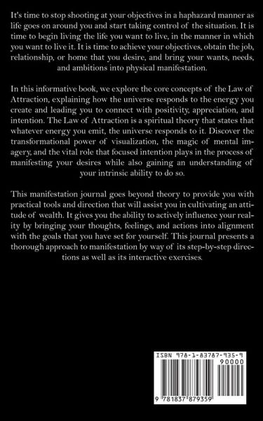 It's time to stop shooting at your objectives in a haphazard manner as life goes on around you and start taking control of the situation. It is time to begin living the life you want to live, in the manner in which you want to live it. It is time to achieve your objectives, obtain the job, relationship, or home that you desire, and bring your wants, needs, and ambitions into physical manifestation. In this informative book, we explore the core concepts of the Law of Attraction, explaining how the universe responds to the energy you create and leading you to connect with positivity, appreciation, and intention. The Law of Attraction is a spiritual theory that states that whatever energy you emit, the universe responds to it. Discover the transformational power of visualization, the magic of mental imagery, and the vital role that focused intention plays in the process of manifesting your desires while also gaining an understanding of your intrinsic ability to do so. This manifestation journal goes beyond theory to provide you with practical tools and direction that will assist you in cultivating an attitude of wealth. It gives you the ability to actively influence your reality by bringing your thoughts, feelings, and actions into alignment with the goals that you have set for yourself. This journal presents a thorough approach to manifestation by way of its step-by-step directions as well as its interactive exercises.