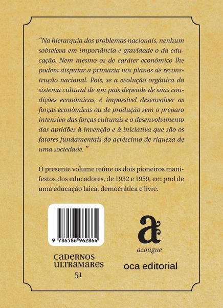 Cadernos Ultramares seeks to present Brazilian culture and thought in a qualified way, through volumes bringing together important essays by renowned authors in different areas of knowledge. The present volume brings together the two pioneering educators' manifestos of 1932 and 1959 in favor of a secular, democratic, and free education.
