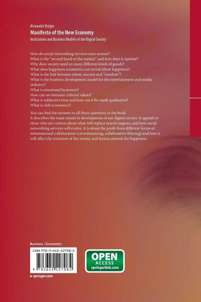The book describes the main directions for the development of the digital society. The author angles its book to those who are interested to know what would replace search engines, and how social networks would evolve; what profit can be made of different forms of informational collaboration (crowdsourcing, collaborative filtering). And, the main thing, how it will influence the structure of the society and human pursuit for happiness. The author does not confine himself to a theory, he sets and solves practical questions: How talent, success and stardom are interconnected, how to make money in social networks, what is the business model for the development of entertainment and media, how to measure cultural values, and what is the subjective time of the individual and how to make it qualitative? There have been no answers to these questions before. Internet and social networks have provided tools and data that Alexander Dolgin was the first to use in economics.