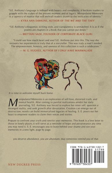 It is time to welcome myself back home. Manipulated Memories is an exploration of self-love, distorted truth, and mental health. After coming to painful realizations amidst her daily journaling, S.E. Anthony was forced to explore her inner self, question a deranged reality, and seek growth after devastation. Creation can emerge out of destruction; words can build immortalized legacies of healing. S. E. pours out her heart to empower readers to claim their voices and stories. Prepare to confront your truth and rewrite your memories. This book is a love letter to those in lonely places; it will serve as a reminder of hope and perseverance any time you may need it. S. E. encourages you to leave behind your shame and see your memories in a new light, page by page. you deserve abundance, you are abundant, may tomorrow remind you of that.