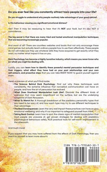 Do you ever feel like you constantly attract toxic people into your life? Do you struggle to understand why people routinely take advantage of your good nature? Is this behaviour causing you significant emotional distress? If you've experienced any of that, then it may be reassuring to hear that it is NOT your fault, but it's also NOT a coincidence... It's also not because you're "too nice," it's not karma doing its work, and it's definitely not the universe trying to teach you something. The big secret is that there are many tried and tested emotional manipulation techniques that are becoming increasingly popular. And worst of all? There are countless websites and books that not only encourage these mind games, but actually teach ordinary people how to use them effectively. These people do not care about the consequences of their actions, and will make sure they use whatever skills they have acquired to get exactly what they want, no matter what impact it has on you. And it's more common than you might think. Dark Psychology has become a highly lucrative industry, which means you never know who (or what) you might be dealing with. Luckily, it does not have to be that way anymore... In the Manipulation & Dark Psychology Protection Blueprint, you will learn how to identify these powerful mental persuasion techniques and their triggers, what effect they have had on your past relationships and your own self-esteem, and proactive steps that you can take RIGHT NOW to guard yourself against them. Here's a preview of what you'll find inside:The Science Behind Dark Psychology: Find out why these techniques work consistently, the extreme influence that nonverbal communication can have on people, and how the art of persuasion has evolved with the changing new social climate. What Does Emotional Manipulation Look Like?: Discover the different kinds of scenarios that may seem insignificant on the surface, but could be the underlying symptoms of Dark Persuasion. What To Watch For: A thorough breakdown of the predatory personality types that you need to be wary of, and how each type may try to use different techniques to their advantage. The Real Consequences: Learn the very real impact these practices can have on your emotional wellbeing, and why it's so important to safeguard yourself from them. Taking Back Control: Learn how to spot the classic signs of mental manipulation that most people are unaware of, get proven strategies for dealing with predatory psychological behaviours safely, PLUS practical tools for self-worth improvement in the aftermath. And much, much more! If you suspect that you may have suffered from the effects of Dark Psychology, then you owe it to yourself to learn more about it. Even if you've spent years blaming yourself for your failures, or you feel like you're over it, you never know what's around the corner. For a more peaceful existence, click "Add to Cart." This comes with huge reward!