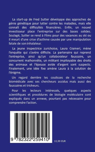 La jeune entreprise de Fred Sutter développe des aproches de génie génétique pour lutter contre les maladies, mais elle connaît des difficultés financières. Enfin, un nouvel investisseur place l'entreprise sur des bases solides. Soulage, Sutter se rend a Flims pour des vacances au ski où il meurtd'une crise d'asthme causée par une manipulation fatale de son inhalateur.L'inspectrice zurichoise Laura Crameri mène l'enquête qui s'avère difficile. Un concurrent malhônnete, un collaborateur faussaire, un militant impitoyable des droits des animaux, la partenaire qui reprend désormais l'entreprise, ainsi que l'épouse avide d'argent sont suspects. Finalement, une idée fixe amène Laura à la solution de lénigme.Un regard derrière les coulisses de la recherche biomédicale avec ses chercheurs assidus mais aussi des faussaires et tricheurs.Pour les lecteurs intéressés, quelques aspects scientifiques et procédures de biologie moléculaire sont expliquées dans l'annexe, pourtant pas nécessaire pour comprendre l'action.