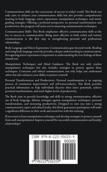 Communication skills are the cornerstone of success in today's world. This Book not only aims to enhance your communication skills but also provides comprehensive training in body language, micro expressions, manipulation techniques, and mind-guiding strategies. Offering a profound perspective on personal transformation and productivity, this program will assist you in mastering communication techniques. Communication Skills: This Book emphasizes effective communication skills as the key to success in communication. Being more effective in both verbal and written communication is the first step in strengthening personal and professional relationships. Body Language and Micro Expressions: Communication goes beyond words. Reading and using body language correctly provides a deeper understanding in communication. Recognizing micro expressions is important in understanding the true feelings of those around you. Manipulation Techniques and Mind Guidance: The Book not only teaches manipulation techniques but also includes strategies to protect against these techniques. Conscious and ethical communication not only helps you understand others but also enhances your ability to protect yourself. Personal Transformation and Productivity: Personal transformation is an ongoing process of continuous improvement and self-transcendence. This Book provides practical information to help individuals discover their inner potentials, achieve personal transformation, and reach higher levels of productivity. The Book aims to provide knowledge and skills in strong communication, effective use of body language, defense strategies against manipulation techniques, personal transformation, and increasing productivity. Designed to turn you into a strong communication expert and ethical leader, this Book guarantees participants will make a significant difference in their work and social lives with this training. If you want to learn manipulation techniques and develop strategies to protect yourself from such manipulations! Improve yourself for successful communication and healthy relationships!