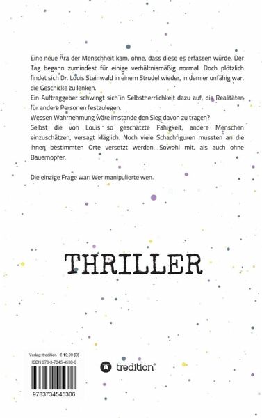 Eine neue Ära der Menschheit kam, ohne dass diese es erfassen würde. Der Tag begann zumindest für einige verhältnismäßig normal. Doch plötzlich findet sich Dr. Louis Steinwald in einem Strudel wieder, in dem er unfähig war die Geschicke zu lenken. Ein Auftraggeber schwingt sich in Selbstherrlichkeit dazu auf die Realitäten für andere Personen festzulegen. Wessen Wahrnehmung wäre imstande den Sieg davon zu tragen? Selbst die von Louis so geschätzte Fähigkeit andere Menschen einzuschätzen versagt kläglich. Noch viele Schachfiguren mussten an die ihnen bestimmten Orte versetzt werden. Sowohl mit als auch ohne Bauernopfer. Die einzige Frage war: Wer manipulierte wen.