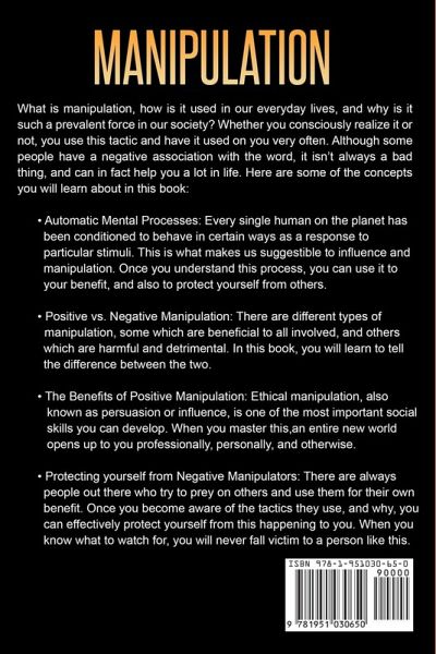 Manipulation Series Book #1 What is manipulation, how is it used in our everyday lives, and why is it such a prevalent force in our society? Whether you consciously realize it or not, you use this tactic and have it used on you very often. Although some people have a negative association with the word, it isn't always a bad thing, and can in fact help you a lot in life. Here are some of the concepts you will learn about in this book: Automatic Mental Processes: Every single human on the planet has been conditioned to behave in certain ways as a response to particular stimuli. This is what makes us suggestible to influence and manipulation. Once you understand this process, you can use it to your benefit, and also to protect yourself from others. Positive vs. Negative Manipulation: There are different types of manipulation, some which are beneficial to all involved, and others which are harmful and detrimental. In this book, you will learn to tell the difference between the two. The Benefits of Positive Manipulation: Ethical manipulation, also known as persuasion or influence, is one of the most important social skills you can develop. When you master this, an entire new world opens up to you professionally, personally, and otherwise. Protecting yourself from Negative Manipulators: There are always people out there who try to prey on others and use them for their own benefit. Once you become aware of the tactics they use, and why, you can effectively protect yourself from this happening to you. When you know what to watch for, you will never fall victim to a person like this. And much more.... Click Download and start the journey of better understanding human psychology today.