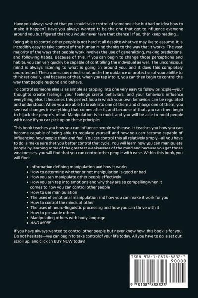 Have you always wished that you could take control of someone else but had no idea how to make it happen? Have you always wanted to be the one that got to influence everyone around you but figured that you would never have that chance? If so, then keep reading... Being able to control other people is not hard at all despite what we may like to assume. It is incredibly easy to take control of the human mind thanks to the way that it works. The vast majority of the ways that people work involves the use of generalizing, making predictions, and following habits. Because of this, if you can begin to change those perceptions and habits, you can very quickly be capable of controlling the individual as well. The unconscious mind is always listening to what is going on around you, and it does this completely unprotected. The unconscious mind is not under the guidance or protection of your ability to think rationally, and because of that, when you tap into it, you can then begin to control the way that people respond and behave. To control someone else is as simple as tapping into one very easy to follow principle-your thoughts create feelings, your feelings create behaviors, and your behaviors influence everything else. It becomes this perfect loop in which your own behaviors can be regulated and understood. When you are able to break into one of them and change one of them, you see real changes in everything that comes after it, and because of that, you can then begin to hijack the people's mind. Manipulation is to mold, and you will be able to mold people with ease if you can pick up on these principles. This book teaches you how you can influence people with ease. It teaches you how you can become capable of being able to regulate yourself and how you can become capable of influencing how people think and feel. You can control this all relatively simply-all you have to do is make sure that you better control that cycle. You will learn how you can manipulate people by learning some of the greatest weaknesses of the mind and because you get those weaknesses, you will find that you can control other people with ease. Within this book, you will find:Information defining manipulation and how it works How to determine whether or not manipulation is good or bad How you can manipulate other people effectively How you can tap into emotions and why they are so compelling when it comes to how you can control other people How to use manipulation The uses of emotional manipulation and how you can make it work for you How to control the minds of other The uses of neuro-linguistic processing and how you can thrive with it How to persuade others Manipulating others with body language AND MORE If you have always wanted to control other people but never knew how, this book is for you. Do not hesitate-you can begin to take control of your life today. All you have to do is set out, scroll up, and click on BUY NOW today!