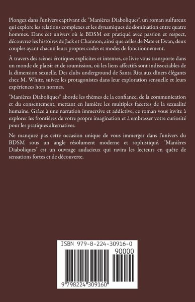 Plongez dans l'univers captivant de "Manières Diaboliques", un roman sulfureux qui explore les relations complexes et les dynamiques de domination entre quatre hommes. Dans cet univers où le BDSM est pratiqué avec passion et respect, découvrez les histoires de Jack et Channon, ainsi que celles de Nate et Ewan, deux couples ayant chacun leurs propres codes et modes de fonctionnement. À travers des scènes érotiques explicites et intenses, ce livre vous transporte dans un monde de plaisir et de soumission, où les liens affectifs sont indissociables de la dimension sexuelle. Des clubs underground de Santa Rita aux dîners élégants chez M. White, suivez les protagonistes dans leur exploration sensuelle et leurs expériences hors normes. "Manières Diaboliques" aborde les thèmes de la confiance, de la communication et du consentement, mettant en lumière les multiples facettes de la sexualité humaine. Grâce à une narration immersive et addictive, ce roman vous invite à explorer les frontières de votre propre imagination et à embrasser votre curiosité pour les pratiques alternatives. Ne manquez pas cette occasion unique de vous immerger dans l'univers du BDSM sous un angle résolument moderne et sophistiqué. "Manières Diaboliques" est un ouvrage audacieux qui ravira les lecteurs en quête de sensations fortes et de découverte.
