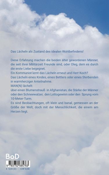 Das Lächeln als Zustand des idealen Wohlbefindens! In diesem Band erzählt mit Geschichten von Männern, die in diesen Zustand gelangen oder ganz in die Nähe kommen. Mit der unmittelbaren Teilnahme an ihren Gedanken und Gefühlen, ihren Ängsten und Nöten, die oftmals den eigenen ähneln, ist die Verbundenheit mit den Figuren gegeben. Es sind Beobachtungen, oft kleine und banal gemessen an der Größe der Welt, doch mit der Menschlichkeit, die zu Herzen geht. Mit feiner Leichtigkeit wird erzählt wie es ein Lächeln dazu bringt, Ängste zu überwinden und das nicht mühelose Miteinander hinzukriegen. Auch die Angepassten und Spießer und die Kleinen und Unauffälligen bekommen eine Stimme, mal mit Humor und immer mit Respekt. Jede Figur ist ausgefüllt mit dem passenden Klang, weder überflüssig noch aufgesetzt. Lächeln haucht Leben ein; diese Erfahrung machen die beiden älter gewordenen Männer, die seit ihrer Militärzeit Freunde sind, oder Oleg, dem diese die erste Liebe zeigt. Ein Kommunist lernt das Lächeln erneut und Herr Koch? Das Lächeln eines Kindes, eines Bettlers oder eines Sterbenden, in warmherziger Anteilnahme. MAN(N) lächelt: über einen Blumenstrauß in Afghanistan, die Stärke der Männer oder den Schneewalzer.MAN(N) lächelt über den Lottogewinn oder den Sprung vom 10-Meter Turm