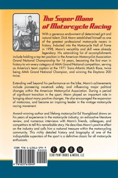 With a generous endowments of determined grit and natural talent, Dick Mann established himself as one of the greatest professional motorcycle racers in history. Inducted into the Motorcycle Hall of Fame in 1998, Mann’s versatility and skill were already legendary. His astonishing list of accomplishments include holding a top ten position in the American Motorcyclist Association Grand National Championship for 16 years, becoming the first man in history to win every category of AMA Grand National competition, serving as America’s team captain at the 1971 Trans-Atlantic Match Race, twice being AMA Grand National Champion, and winning the Daytona 200 twice. Extending well beyond his performance on the bike, Mann’s achievements include pioneering racetrack safety, and influencing major political changes within the American Motorcyclist Association. During a period of significant transition in the sport, Mann played an important role in bringing about many positive changes. He also encouraged the expansion of motocross, and became an inspiring leader in the vintage motorcycle racing movement. Award-winning author and lifelong motorcyclist Ed Youngblood draws on his years of experience in the motorcycle industry, an exhaustive literature review, and numerous interviews with Mann’s friends, colleagues, and competitors to tell this remarkable story. He describes Mann’s positive effect on the industry and calls him a national treasure within the motorcycling community. This richly detailed history and biography of one of the indisputable superstars of the sport is a definitive classic for all motorcycle