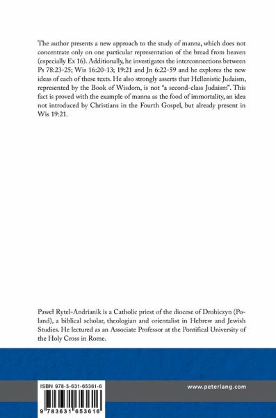 The author presents a new approach to the study of manna, which does not concentrate only on one particular representation of the bread from heaven (especially Ex 16). Additionally, he investigates the interconnections between Ps 78:23-25, Wis 16:20-13; 19:21 and Jn 6:22-59 and he explores the new ideas of each of these texts. He also strongly asserts that Hellenistic Judaism, represented by the Book of Wisdom, is not "a second-class Judaism". This fact is proved with the example of manna as the food of immortality, an idea not introduced by Christians in the Fourth Gospel, but already present in Wis 19:21.