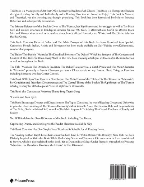 The Amazing Author, Ralph Lee as Kai Lumumba, born June 4, 1948 in Brownsville, Brooklyn New York, has been Divinely Inspired to Write this Book While Under Very Severe and Traumatic Circumstances he have been blessed to Survive, which is also explained in this book. Yet as Diamonds are Made Under Pressure, through these Pressures "Manakka The Dreadlock Prostitute the Debate" is That Diamond!