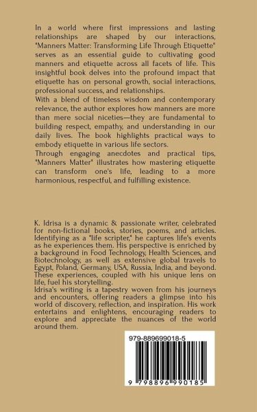 In a world where first impressions and lasting relationships are shaped by our interactions, "Manners Matter: Transforming Life Through Etiquette" serves as an essential guide to cultivating good manners and etiquette across all facets of life. This insightful book delves into the profound impact that etiquette has on personal growth, social interactions, professional success, and relationships. With a blend of timeless wisdom and contemporary relevance, the author explores how manners are more than mere social niceties-they are fundamental to building respect, empathy, and understanding in our daily lives. The book highlights practical ways to embody etiquette in various life sectors. Through engaging anecdotes and practical tips, "Manners Matter" illustrates how mastering etiquette can transform one's life, leading to a more harmonious, respectful, and fulfilling existence. This book is a must-read for anyone looking to improve their social skills and make a positive impact on the world around them.