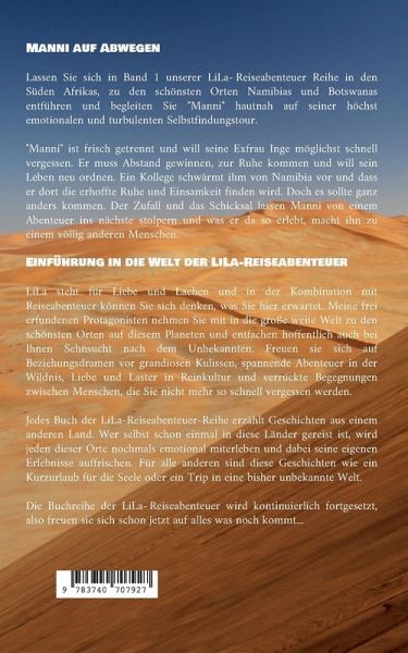 Manni auf AbwegenLassen Sie sich in Band 1 unserer LiLa-Reiseabenteuer-Reihe in den Süden Afrikas, zu den schönsten Orten Namibias und Botswanas entführen und begleiten Sie Manni hautnah auf seiner höchst emotionalen und turbulenten Selbstfindungstour Manni ist frisch getrennt und will seine Exfrau Inge möglichst schnell vergessen. Er muss Abstand gewinnen, zur Ruhe kommen und will sein Leben neu ordnen. Ein Kollege schwärmt ihm von Namibia vor und dass er dort die erhoffte Ruhe und Einsamkeit finden wird. Doch es sollte anders kommen. Der Zufall und das Schicksal lassen Manni von einem Abenteuer ins nächste stolpern und was er da so erlebt, macht ihn zu einem völlig anderen Menschen ...Einführung in die Welt der LiLa-ReiseabenteuerLiLa steht für Liebe und Lachen und in der Kombination mit Reiseabenteuer können Sie sich denken, was Sie hier erwartet. Meine frei erfundenen Protagonisten nehmen Sie mit in die große weite Welt zu den schönsten Orten auf diesem Planeten und entfachenhoffentlich auch bei Ihnen Sehnsucht nach dem Unbekannten. Freuen sie sich auf Beziehungsdramen vor grandiosen Kulissen, spannende Abenteuer in der Wildnis, Liebe und Laster in Reinkultur und verrückte Begegnungen zwischen Menschen, die Sie nicht mehr so schnell vergessen werden. Jedes Buch der LiLa-Reiseabenteuer-Reihe erzählt Geschichten aus einem anderen Land. Wer selbst schon einmal in diese Länder gereist ist, wird jeden dieser Orte nochmals emotional miterleben und dabei seine eigenen Erlebnisse auffrischen. Für alle anderen sind diese Geschichten wie ein Kurzurlaub für die Seele oder ein Trip in eine bisher unbekannte Welt. Die Buchreihe der LiLa-Reiseabenteuer wird kontinuierlich fortgesetzt, also freuen sie sich schon jetzt auf alles was noch kommt...
