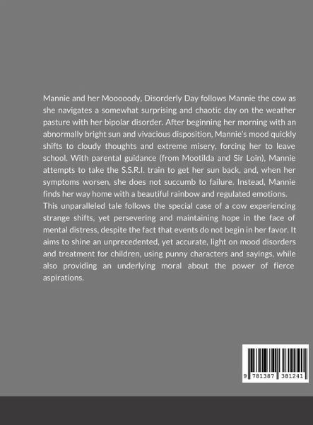 Mannie and her Mooooody, Disorderly Day follows Mannie the cow as she navigates a somewhat surprising and chaotic day on the weather pasture with her bipolar disorder. After beginning her morning with an abnormally bright sun and vivacious disposition, Mannie's mood quickly shifts to cloudy thoughts and extreme misery, forcing her to leave school. With parental guidance (from Mootilda and Sir Loin), Mannie attempts to take the S.S.R.I. train to get her sun back, and, when her symptoms worsen, she does not succumb to failure. Instead, Mannie finds her way home with a beautiful rainbow and regulated emotions. This unparalleled tale follows the special case of a cow experiencing strange shifts, yet persevering and maintaining hope in the face of mental distress, despite the fact that events do not begin in her favor. It aims to shine an unprecedented, yet accurate, light on mood disorders and treatment for children, using punny characters and sayings, while also providing an underlying moral about the power of fierce aspirations.