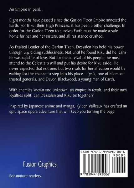 Eight months have passed since the Garlon T'zen Empire annexed the Earth. For Kiku, their High Princess, it has been a bitter challenge. In order for the Garlon T'zen to survive, Earth must be made a safe home for her and her sisters, and all resistance crushed. As Exalted Leader of the Garlon T'zen, Dessalen has held his power through unyielding ruthlessness. Not until he found Kiku did he learn he was capable of love. But for the survival of his people, he must attend to the Celestial's will and put his desire for Kiku aside. He never expected that not one, but two rivals for her affection would be waiting for the chance to step into his place-Lysis, one of his most trusted generals, and Devon Blackwood, a young man of Earth. With enemies known and unknown, an empire in revolt, and their own loyalties split, can Dessalen and Kiku be together? For mature readers.
