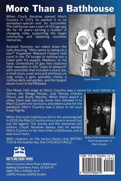 More Than a Bathhouse When Chuck Renslow opened Man's Country in 1973, he wanted it to be someplace special-and he succeeded. The bathhouse was a part of Chicago gay life for 45 years-serving a number of changing roles, supporting the larger community, and spawning countless memories. Rudolph Nureyev ran naked down the halls shouting, "Who wants to swing on a star?" Puppeteer Wayland Flowers held court in the TV lounge in nothing but a towel with his puppet, Madame, on his hand. Generations of gay men explored their sexuality in this "oasis of pleasure" with amenities that included a snack bar, a retail store, a wet area and whirlpool, an orgy room, a gym, specialty rooms, a rooftop deck and garden, and the largest steam room in the Midwest. The Music Hall stage at Man's Country was a venue for such talents as Divine, the Village People, Judy Tenuta, Charles Pierce, and Rusty Warren. When there wasn't a show, there was dancing. Some men checked in to Man's Country for six hours, and others came for the weekend. Man's Country was a place to let your freak flag fly. When the iconic bathhouse fell to the wrecking ball in 2018, the Man's Country story came to an end, but not the legend. The stories and the memories will endure. Chuck Renslow always said he wanted Man's Country to be more than a bathhouse, and it was much more. With chapters on the techno-dance club BISTRO TOO & the leather bar, the CHICAGO EAGLE.