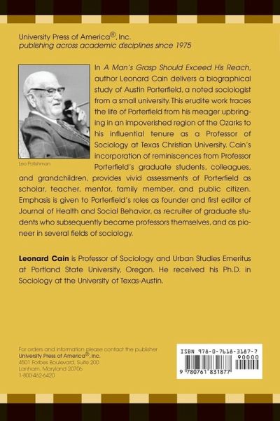 In A Man's Grasp Should Exceed His Reach, author Leonard Cain delivers a biographical study of Austin Porterfield, a noted sociologist from a small university. This erudite work traces the life of Porterfield from his meager upbringing in an impoverished region of the Ozarks to his influential tenure as a Professor of Sociology at Texas Christian University. Emphasis is given to Porterfield's roles as founder and first editor of the Journal of Health and Social Behavior and as a pioneer in several fields of sociology.