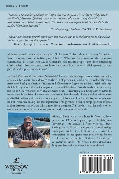 Mahatma Gandhi was quoted as saying, "I like your Christ. I do not like your Christians. Your Christians are so unlike your Christ." What an indictment of the Christian community. Is it true? Are we, as Christians, the reason people keep from embracing Christianity? Have we caused people to walk away from the one belief system that can provide redemption for their sins? In Man's Rejection of God: Who's Responsible? I devote whole chapters to atheists, agnostics, apostates, hedonists, those devoted to the cult of personality and more. I look at the three main world religions besides Judaism and Christianity. I give the reader a brief look into their belief system and how it compares to that of Christians. I touch on those who say they believe in God yet show no visible evidence of it. I investigate our being able to relate to others outside the faith. I lay out what it means to be vulnerable. I take a look at minimalism and individualism and how they can apply to the Christian. I look at the impact words have on our lives and also dig into the importance of forgiveness. I paint a simple picture of Jesus and underscore that picture with quotes from the great C.S. Lewis. I call for a time of re-assessment as we strive to be more genuine and consistent in our faith.