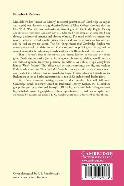 Mansfield Forbes (known as 'Manny' to several generations of Cambridge colleagues and pupils) was the very young historian-Fellow of Clare College who just after the First World War had more to do with the founding of the Cambridge English Faculty and its intellectual basis than anyone else. He was also one of the great Cambridge eccentrics (but a charming one). Innocent, original, unselfconscious and without egoism, his virtues produced his oddities. As a child, Hugh Carey knew him as 'Uncle Manny'. This affectionate portrait, illustrated with photographs, reconstructs Forbes' life, and explores his other interests, which included Scottish domestic architecture and modern art. Mr Carey also uncovers alternative aspects of that vanished but still influential Cambridge that somehow united in intellectual activity Keynes, the Bloomsbury group, the great physicists and biologists, Richards, Leavis and their colleagues: some high-minded, some high-spirited, others open-hearted - and many quite well cushioned by investment income.