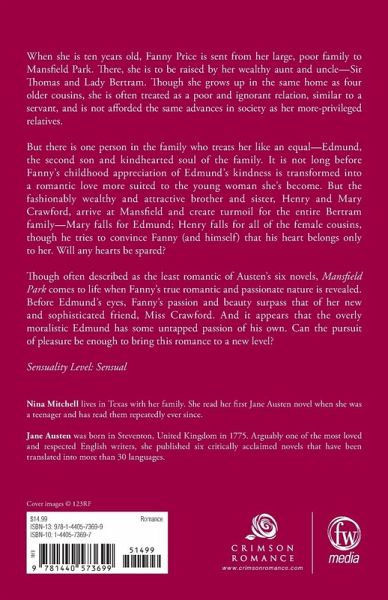When she is 10 years old, Fanny Price is sent from her poor and large family to Mansfield Park, where she is to be raised by her wealthy aunt and uncle, Sir Thomas and Lady Bertram. Though she grows up in the same home as her four older cousins, she is often treated as a poor and ignorant relation, similar to a servant, and is not afforded the same advances into society as her more privileged relatives. But there is one among her relations who treats her as an equal. Edmund is the second son and the kind-hearted soul of the family. It is not long before Fanny's childhood appreciation of Edmund's kindness is transformed into a romantic love more suited to the young woman she's become. But the fashionably wealthy and attractive brother and sister, Henry and Mary Crawford, arrive at Mansfield and create turmoil for the entire Bertram family - Mary falls for Edward, and Henry falls for all of the female cousins, though he tries to convince Fanny (and himself) that his heart belongs only to her. Will any hearts be spared? Though often described as the least romantic of Austen's six novels, Mansfield Park comes to life when Fanny's true romantic and passionate nature is revealed. Indeed before Edmund's eyes Fanny's passion and beauty surpasses that of her new and sophisticated friend, Miss Crawford. And it appears that the overly moralistic Edmund has some untapped passion of his own. Can the pursuit of pleasure be enough to bring this romance to a new level? Sensuality Level: Sensual
