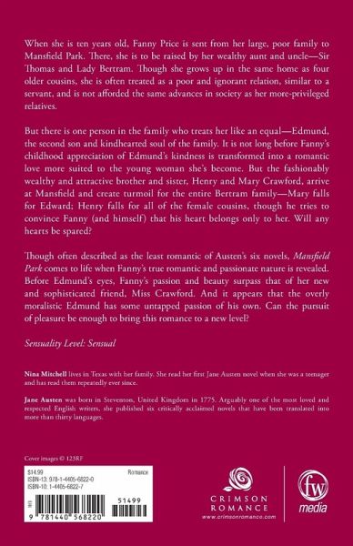 When she is 10 years old, Fanny Price is sent from her poor and large family to Mansfield Park, where she is to be raised by her wealthy aunt and uncle, Sir Thomas and Lady Bertram. Though she grows up in the same home as her four older cousins, she is often treated as a poor and ignorant relation, similar to a servant, and is not afforded the same advances into society as her more privileged relatives. But there is one among her relations who treats her as an equal. Edmund is the second son and the kind-hearted soul of the family. It is not long before Fanny's childhood appreciation of Edmund's kindness is transformed into a romantic love more suited to the young woman she's become. But the fashionably wealthy and attractive brother and sister, Henry and Mary Crawford, arrive at Mansfield and create turmoil for the entire Bertram family - Mary falls for Edward, and Henry falls for all of the female cousins, though he tries to convince Fanny (and himself) that his heart belongs only to her. Will any hearts be spared? Though often described as the least romantic of Austen's six novels, Mansfield Park comes to life when Fanny's true romantic and passionate nature is revealed. Indeed before Edmund's eyes Fanny's passion and beauty surpasses that of her new and sophisticated friend, Miss Crawford. And it appears that the overly moralistic Edmund has some untapped passion of his own. Can the pursuit of pleasure be enough to bring this romance to a new level? Sensuality Level: Sensual