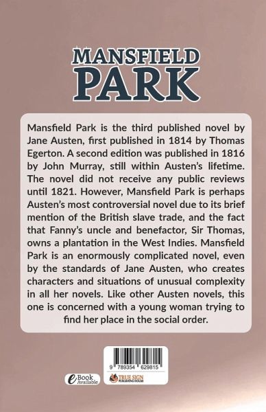 Mansfield Park is the third published novel by Jane Austen, first published in 1814 by Thomas Egerton. A second edition was published in 1816 by John Murray, still within Austen's lifetime. The novel did not receive any public reviews until 1821. However, Mansfield Park is perhaps Austen's most controversial novel due to its brief mention of the British slave trade, and the fact that Fanny's uncle and benefactor, Sir Thomas, owns a plantation in the West Indies. Mansfield Park is an enormously complicated novel, even by the standards of Jane Austen, who creates characters and situations of unusual complexity in all her novels. Like other Austen novels, this one is concerned with a young woman trying to find her place in the social order.