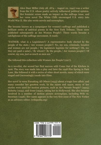 Alice Duer Miller (July 28, 1874 - August 22, 1942) was a writer from the U.S. whose poetry actively influenced political opinion. Her feminist verses made an impact on the suffrage issue, and her verse novel The White Cliffs encouraged U.S. entry into World War II. She also wrote novels and screenplays. She became known as a campaigner for women's suffrage and published a brilliant series of satirical poems in the New York Tribune. These were published subsequently as Are Women People?. These words became a catchphrase of the suffrage movement. It reads: "FATHER, what is a Legislature?/ A representative body elected by the people of the state./ Are women people?/ No, my son, criminals, lunatics and women are not people./ Do legislators legislate for nothing?/ Oh, no; they are paid a salary./ By whom?/ By the people./ Are women people?/ Of course, my son, just as much as men are." She followed this collection with Women Are People! (1917). As a novelist, she scored her first success with Come Out of the Kitchen in 1916. The story was made into a play and later the 1948 film Spring in Park Lane. She followed it with a series of other short novels, many of which were staged and (increasingly) made into films. Her novel in verse Forsaking All Others (1933) about a tragic love affair, and many consider her greatest work. In the 1920s and 1930s, many of her stories were used for motion pictures, such as Are Parents People? (1925), Roberta (1935), and Irene (1940), taking her to Hollywood. She also became involved in a number of motion picture screenplays, including Wife vs. Secretary (1936). Her name appears in the very first issue of The New Yorker as an advisory editor. (wikipedia.org)