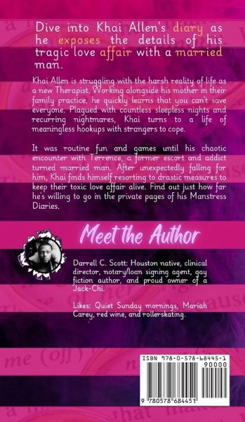 Dive into Khai Allen's diary as he unravels how his affair with a married man took a deadly turn. Khai Allen is struggling with the harsh reality of life as a new Therapist and Clinical Manager. Working alongside his mother in their Family practice, he quickly learns that you can't save everyone. Plagued with countless sleepless nights and recurring nightmares, Khai turns to a life of meaningless hookups with strangers to cope with the anxiety of working in psychiatry and personal demons. It was routine fun and games until his chaotic one-night stand with Terrence, a former escort and recovering addict turned married man. After unexpectedly falling for him, Khai regrettably neglects his work responsibilities and resorts to drastic measures to keep their tumultuous love affair alive. Find out just how far he's willing to go in the private pages of his Manstress Diaries. Triggers include: Addiction and Drug Use S.I. Gay Romance Relationships Erotic Scenes and Language *Ingram Edition*