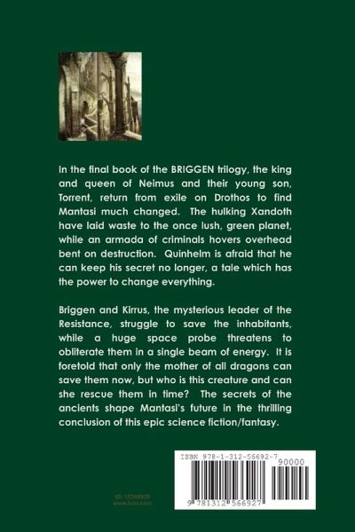 In the final book of the BRIGGEN trilogy, the king and queen of Neimus and their young son, Torrent, return from exile on Drothos to find Mantasi much changed. The hulking Xandoth have laid waste to the once lush, green planet, while an armada of criminals hovers overhead bent on destruction. Quinhelm is afraid that he can keep his secret no longer, a tale which has the power to change everything. Briggen and Kirrus, the mysterious leader of the Resistance, struggle to save the inhabitants, while a huge space probe threatens to obliterate them in a single beam of energy. It is foretold that only the mother of all dragons can save them now, but who is this creature and can she rescue them in time? The secrets of the ancients shape Mantasi's future in the thrilling conclusion of this epic science fiction/fantasy.